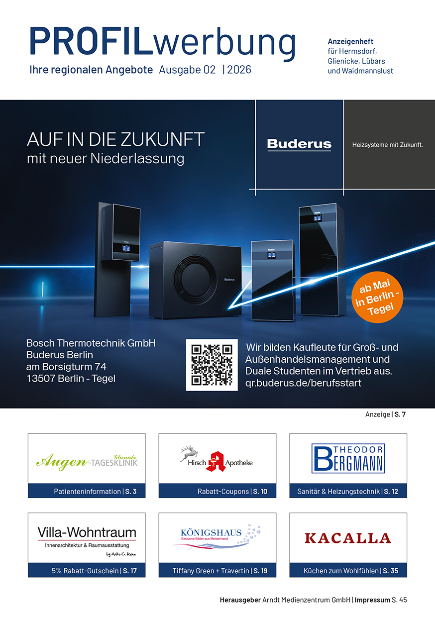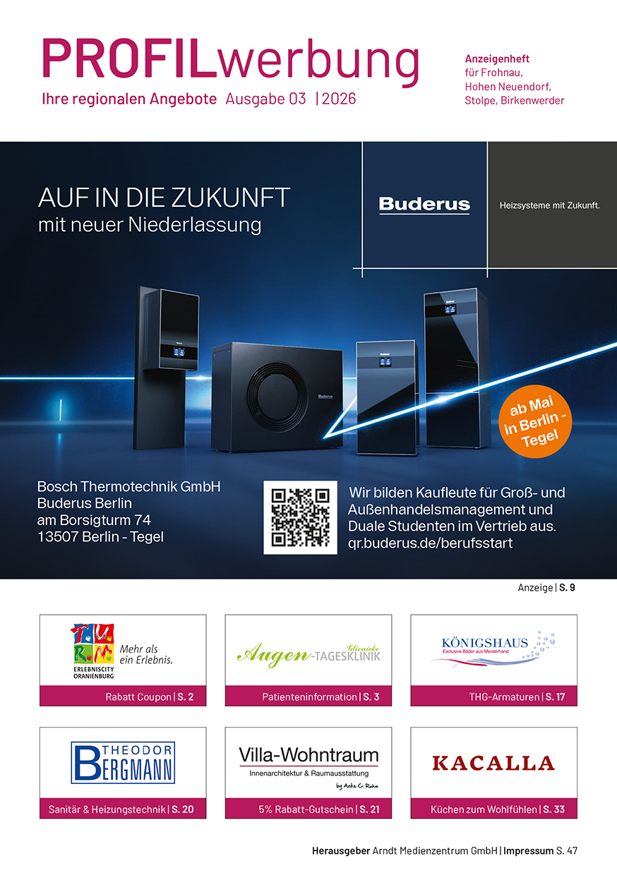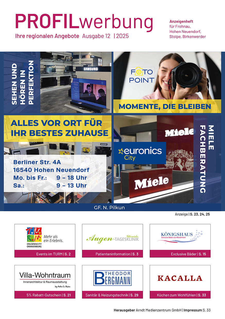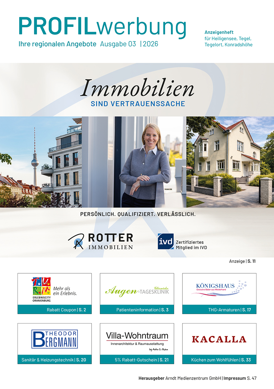 Die Profil-Werbung ist seit über 30 Jahren das bewährte Werbejournal für die Wirtschaftsräume Berlin-Nord und Kreis Oberhavel. Hier präsentieren sich Händler, Handwerker und Dienstleistungs-Unternehmen mit anspruchsvoller Anzeigenwerbung.