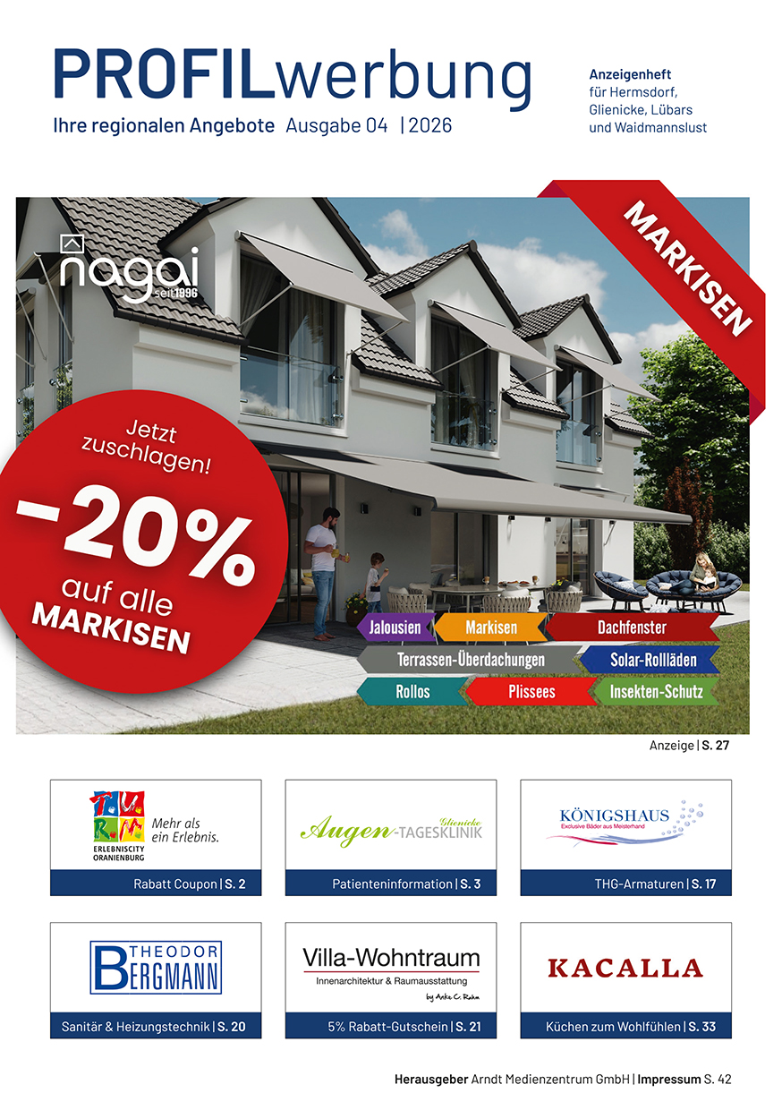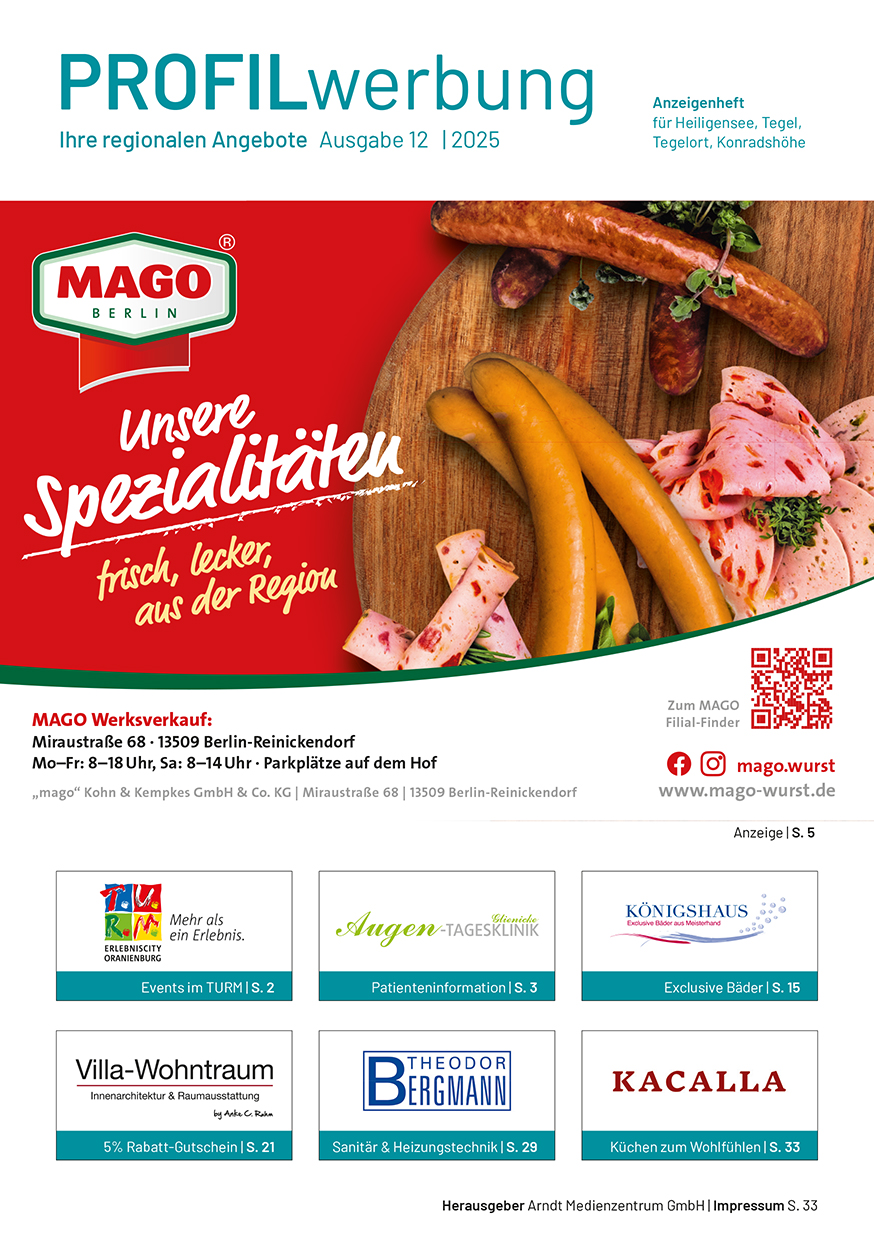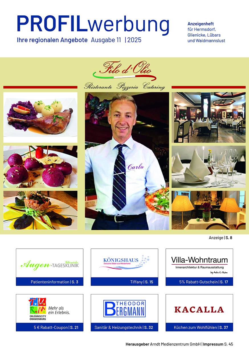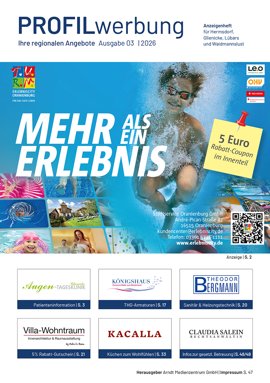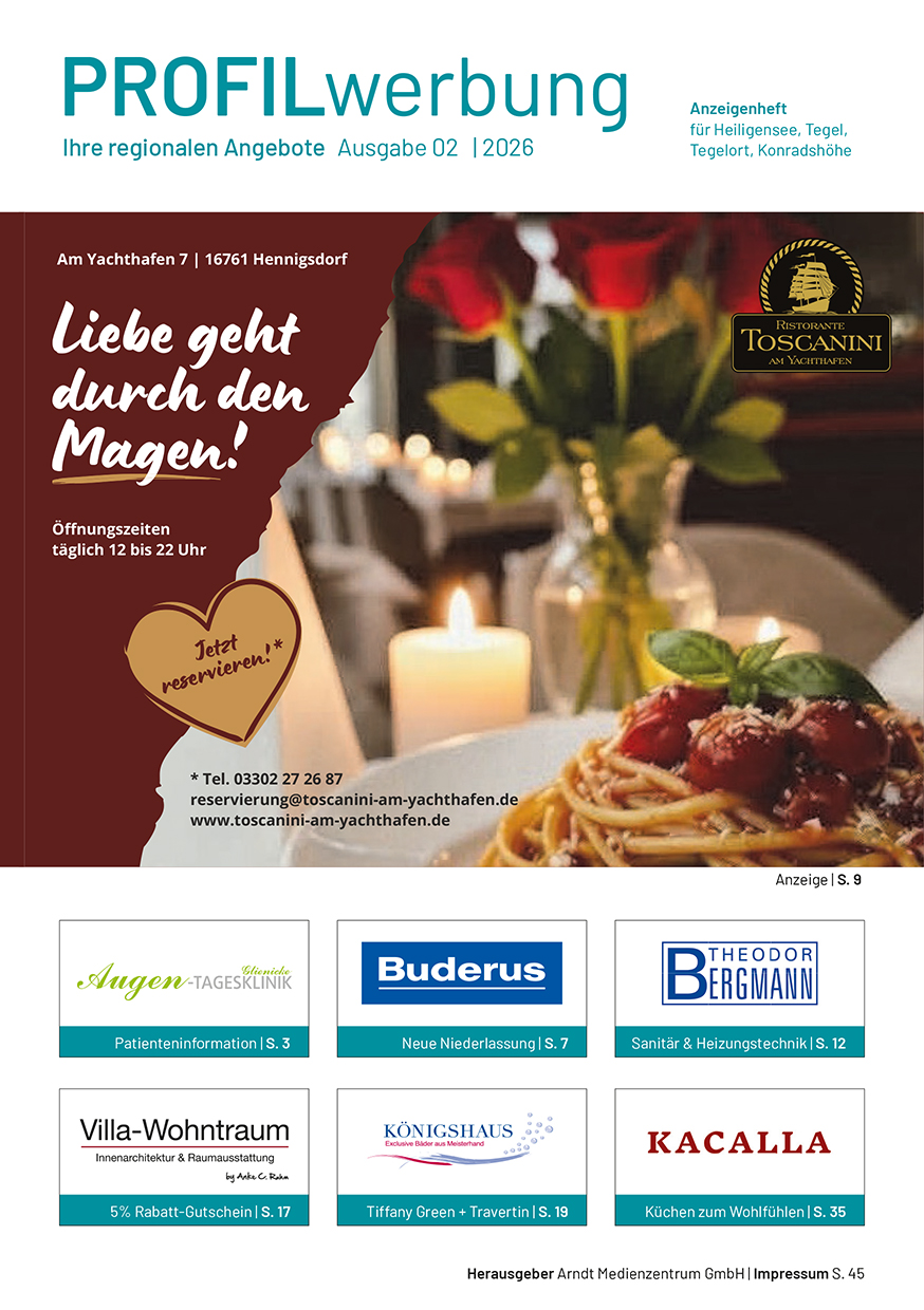 Die Profil-Werbung ist seit über 30 Jahren das bewährte Werbejournal für die Wirtschaftsräume Berlin-Nord und Kreis Oberhavel. Hier präsentieren sich Händler, Handwerker und Dienstleistungs-Unternehmen mit anspruchsvoller Anzeigenwerbung.