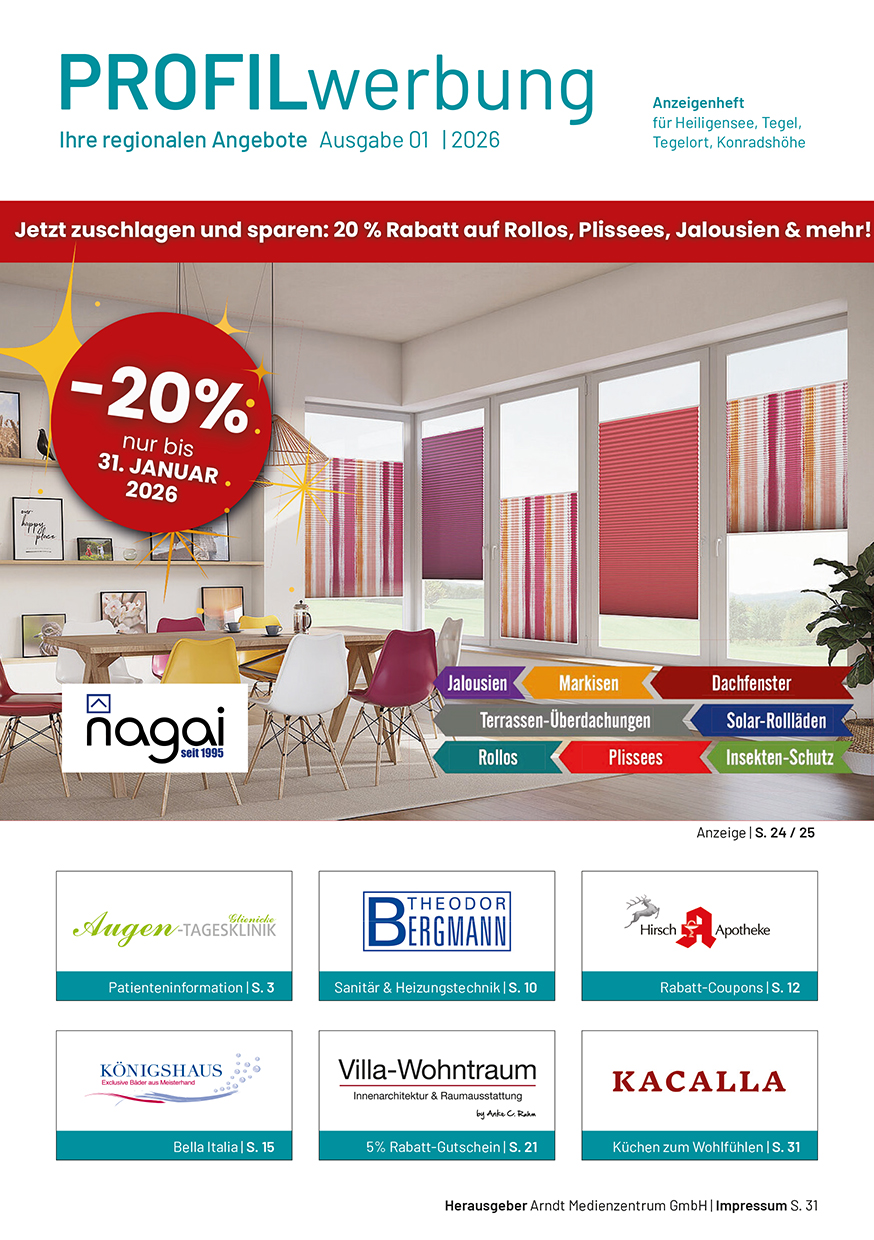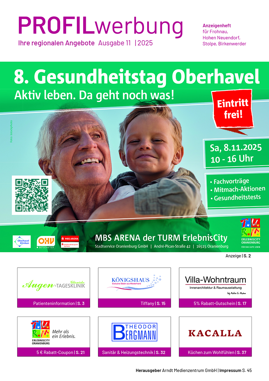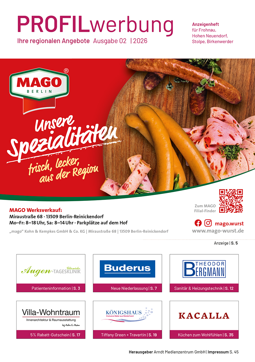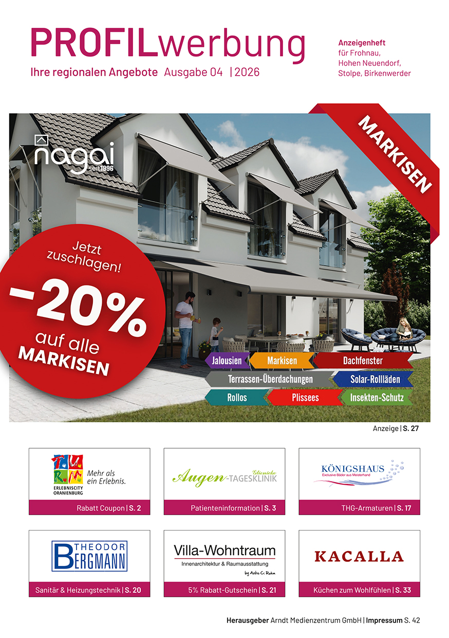 Die Profil-Werbung ist seit über 30 Jahren das bewährte Werbejournal für die Wirtschaftsräume Berlin-Nord und Kreis Oberhavel. Hier präsentieren sich Händler, Handwerker und Dienstleistungs-Unternehmen mit anspruchsvoller Anzeigenwerbung.